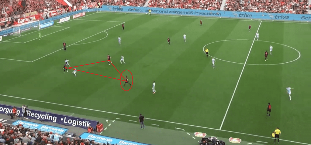 However, as Tapsoba gets pressured, Jonas Hoffman is willing to check in and leave his assigned position in order to form a triangle to help recycle possession, something which is uncommon for other positional teams.