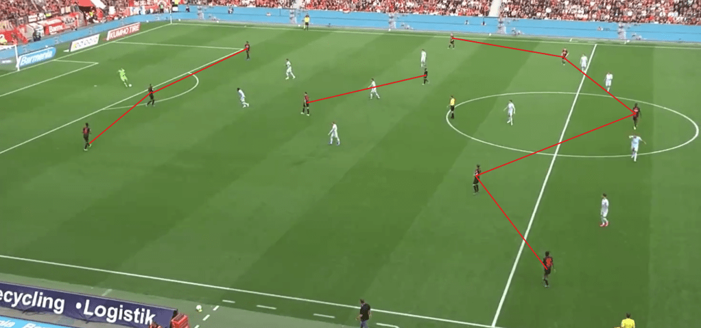 But what differs the team from other positional teams, is the fluidity, especially during build-up. In the example below, Leverkusen look to build out in their 3-2-5 structure.