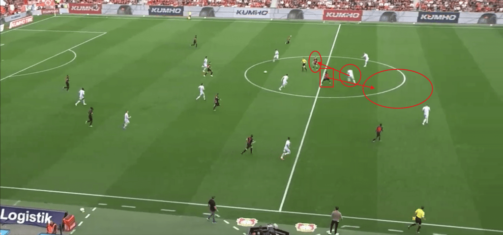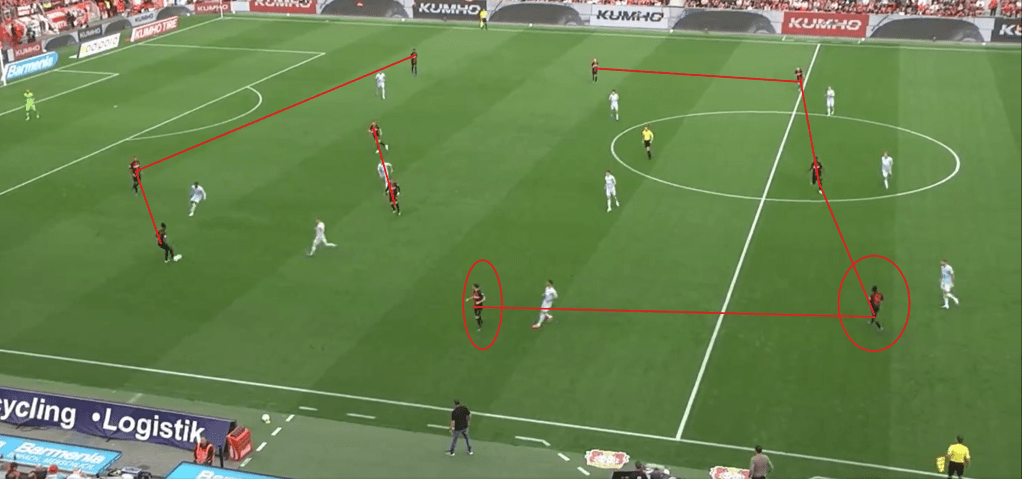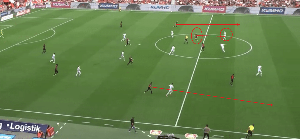 When the pivot receives the ball with acres of space in front of him, Leverkusen look to go vertical and the front 5 are expected to make forward runs. The wing-backs sprint forwards while the 10s (usually Wiertz) moves centrally hoping to drag a defender with him.