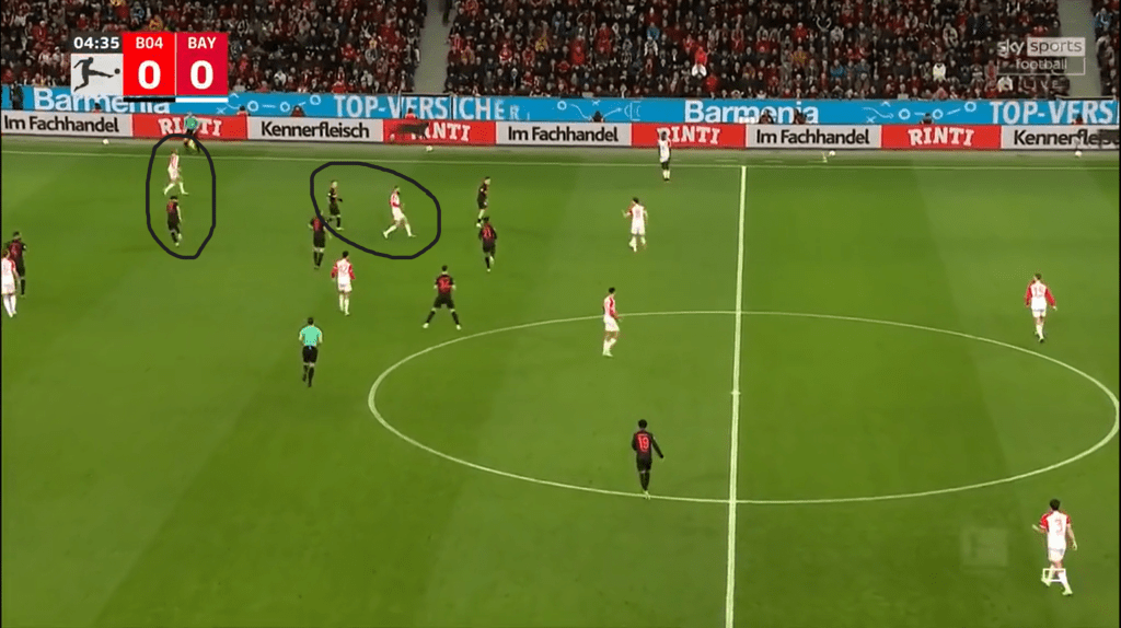 The same dynamics exist when Tapsoba and Hincapié are the ones responsible for the left side of the defense, notice how when Hincapié presses, Tapsoba is the one responsible for shifting across and covering the space behind the left wing-back.