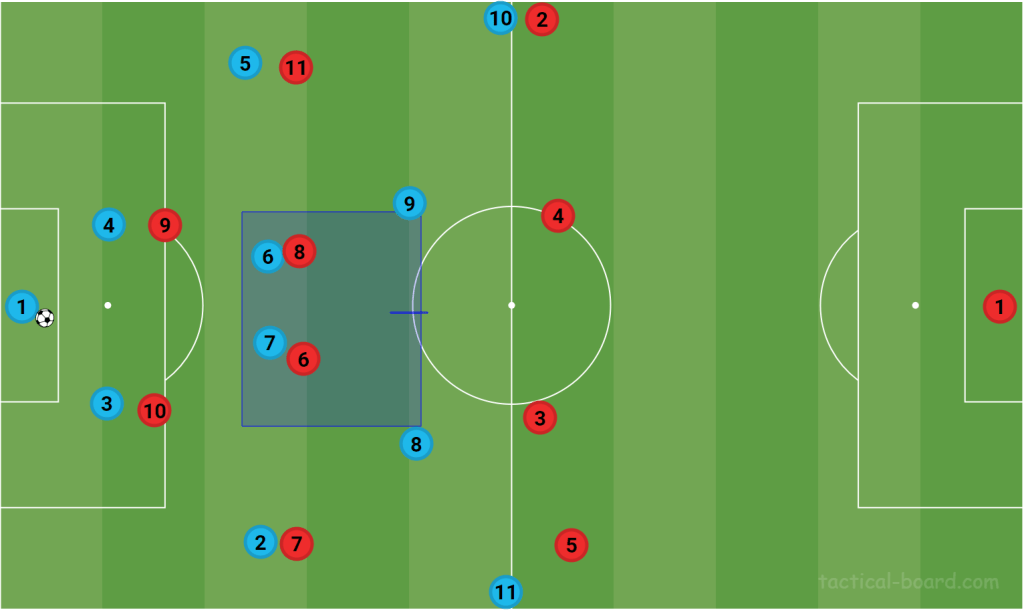 The second possible outcome is if the center-backs choose to let the strikers go deep unmarked. This creates a numerical superiority in the midfield which allows Brighton to comfortably build out.