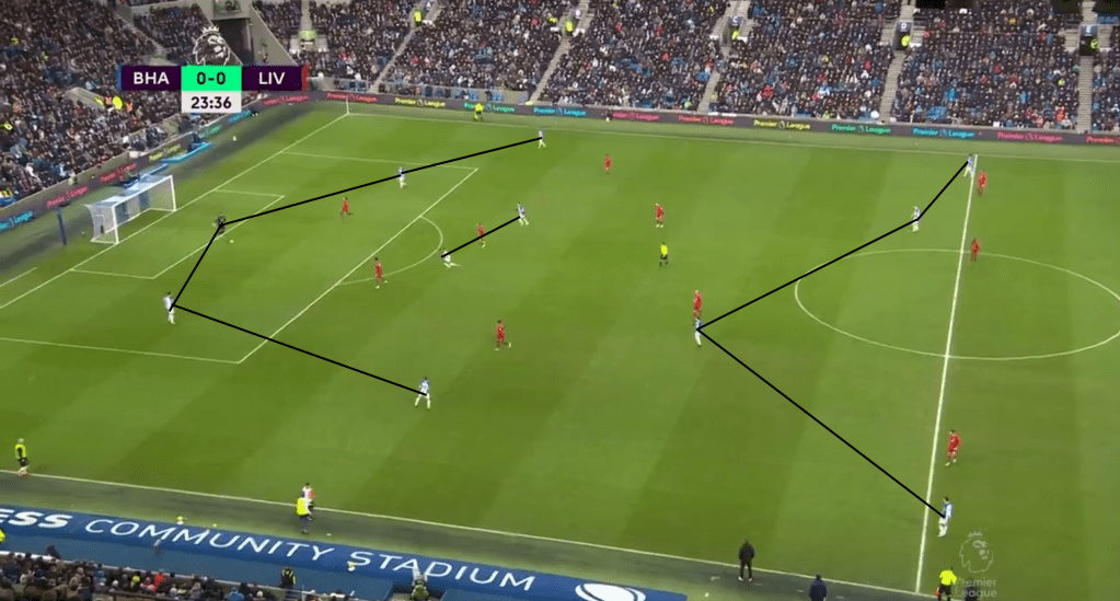 When in a higher build-up and settled offense De Zerbi uses a more positional style of play. With a 2-3-5 shape, De Zerbi uses two 10s in the half spaces, both fullbacks very narrow and very wide wingers. The wingers width stretches out the oppositions back line and allows Brighton to play through the midfield, where they often create overloads.