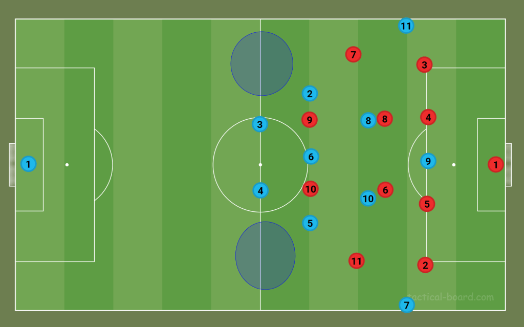 One of De Zerbi’s main principals is a high press, coming from the desire to have control of the ball for as long as possible. Brighton’s press is normally done through man marking. Each defending player is expected to follow their assigned player during the play. In this example against Manchester United away, Brighton mirror United’s 3-2 buildup and tightly mark each player.