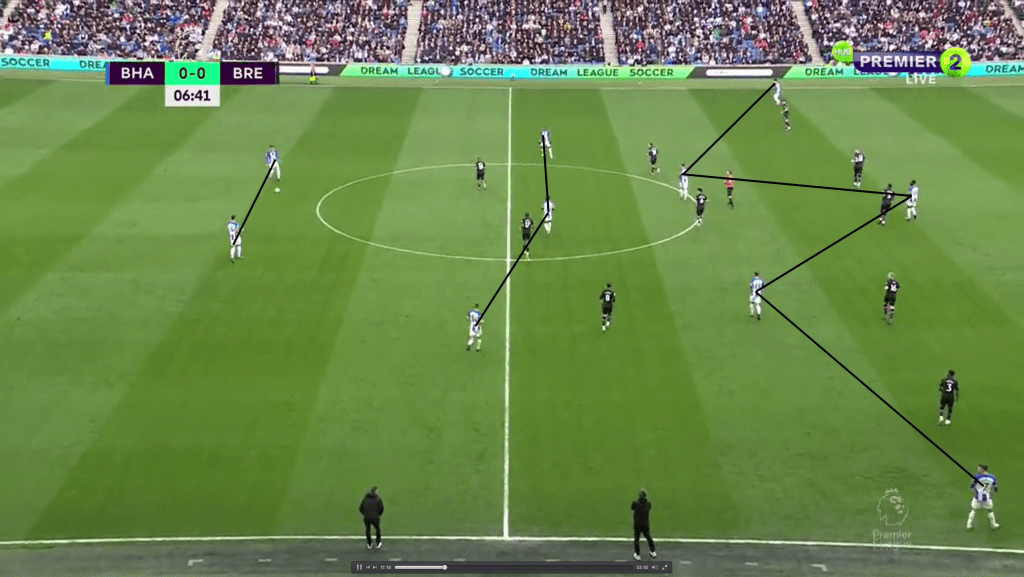 One of the main tools of this Brighton team is the use of the third man concept. What this means is that in low build-up when the opposing team is pressing high and closing down passing lanes, Brighton looks to go around the opposition’s player. This movement is essential to bypass the press and attract even more players into your own half.