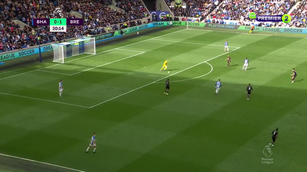 The goal against Brentford at home in the 22/23 Premier League season is a perfect example of the first possibility. Brentford press high when Steele has the ball. The strikers check deep and the center-backs follow. When Brighton’s goalkeeper notices this he plays a long ball into Mitoma who has acres of space.